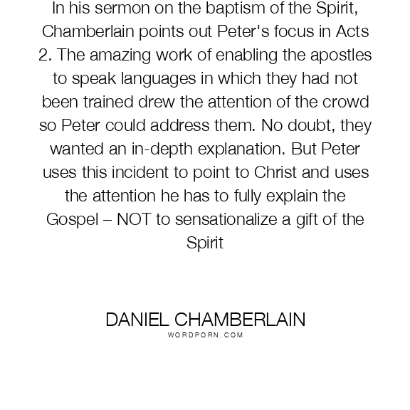 In his sermon on the baptism of the Spirit, Chamberlain points out Peter's focus in Acts 2. The amazing work of enabling the apostles to speak languages in which they had not been trained drew the attention of the crowd so Peter could address them. No doubt, they wanted an in-depth explanation. But Peter uses this incident to point to Christ and uses the attention he has to fully explain the Gospel – NOT to sensationalize a gift of the Spirit