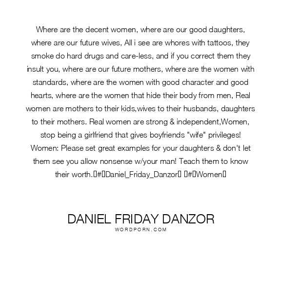 Where are the decent women, where are our good daughters, where are our future wives, All i see are whores with tattoos, they smoke do hard drugs and care-less, and if you correct them they insult you, where are our future mothers, where are the women with standards, where are the women with good character and good hearts, where are the women that hide their body from men, Real women are mothers to their kids,wives to their husbands, daughters to their mothers. Real women are strong & independent,Women, stop being a girlfriend that gives boyfriends "wife" privileges! Women: Please set great examples for your daughters & don't let them see you allow nonsense w/your man! Teach them to know their worth.#Daniel_Friday_Danzor #Women