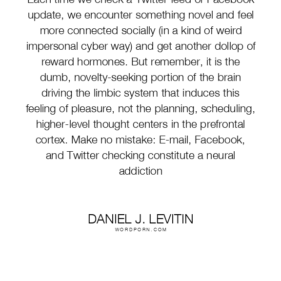 Each time we check a Twitter feed or Facebook update, we encounter something novel and feel more connected socially (in a kind of weird impersonal cyber way) and get another dollop of reward hormones. But remember, it is the dumb, novelty-seeking portion of the brain driving the limbic system that induces this feeling of pleasure, not the planning, scheduling, higher-level thought centers in the prefrontal cortex. Make no mistake: E-mail, Facebook, and Twitter checking constitute a neural addiction