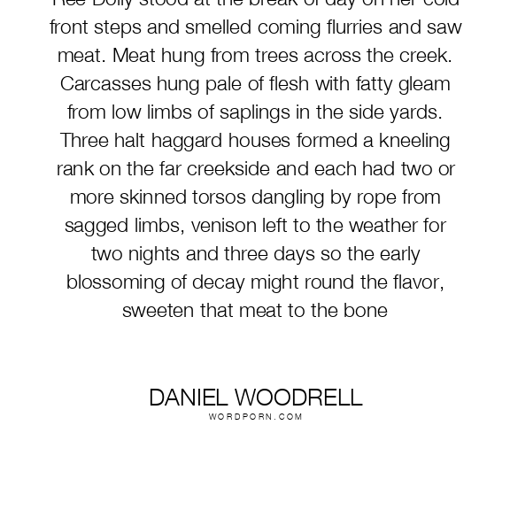 Ree Dolly stood at the break of day on her cold front steps and smelled coming flurries and saw meat. Meat hung from trees across the creek. Carcasses hung pale of flesh with fatty gleam from low limbs of saplings in the side yards. Three halt haggard houses formed a kneeling rank on the far creekside and each had two or more skinned torsos dangling by rope from sagged limbs, venison left to the weather for two nights and three days so the early blossoming of decay might round the flavor, sweeten that meat to the bone