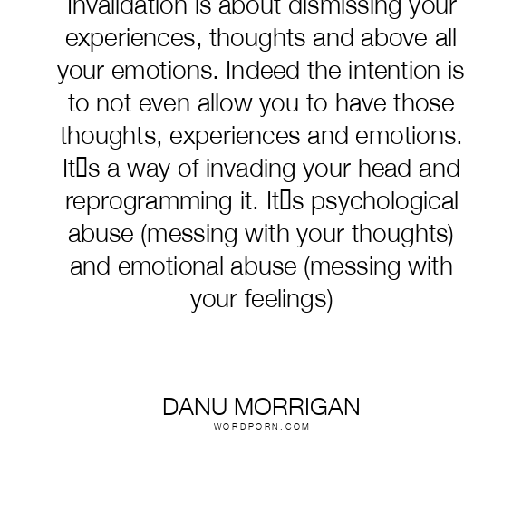 Invalidation is about dismissing your experiences, thoughts and above all your emotions. Indeed the intention is to not even allow you to have those thoughts, experiences and emotions. It‟s a way of invading your head and reprogramming it. It‟s psychological abuse (messing with your thoughts) and emotional abuse (messing with your feelings)