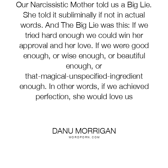 Our Narcissistic Mother told us a Big Lie. She told it subliminally if not in actual words. And The Big Lie was this: If we tried hard enough we could win her approval and her love. If we were good enough, or wise enough, or beautiful enough, or that-magical-unspecified-ingredient enough. In other words, if we achieved perfection, she would love us