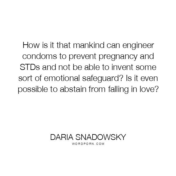 How is it that mankind can engineer condoms to prevent pregnancy and STDs and not be able to invent some sort of emotional safeguard? Is it even possible to abstain from falling in love?