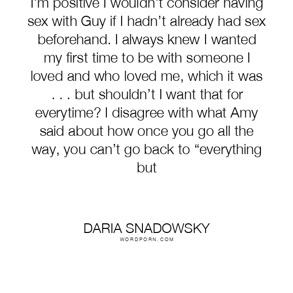 I’m positive I wouldn’t consider having sex with Guy if I hadn’t already had sex beforehand. I always knew I wanted my first time to be with someone I loved and who loved me, which it was . . . but shouldn’t I want that for everytime? I disagree with what Amy said about how once you go all the way, you can’t go back to “everything but