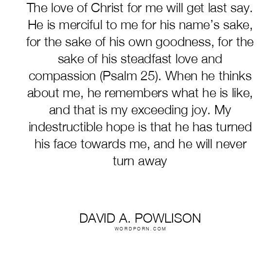 The love of Christ for me will get last say. He is merciful to me for his name’s sake, for the sake of his own goodness, for the sake of his steadfast love and compassion (Psalm 25). When he thinks about me, he remembers what he is like, and that is my exceeding joy. My indestructible hope is that he has turned his face towards me, and he will never turn away