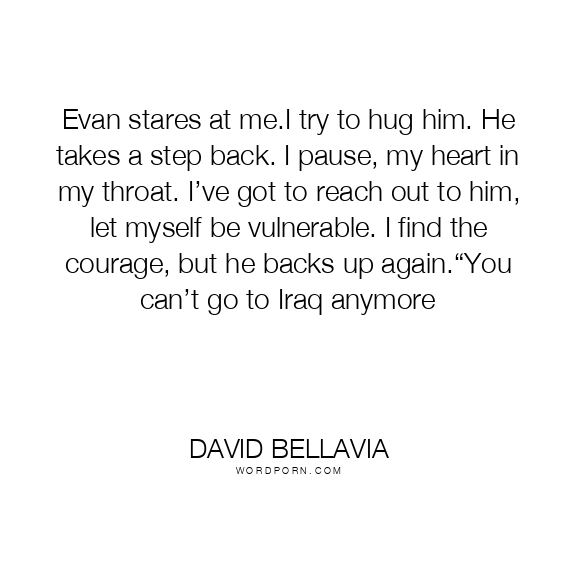 Evan stares at me.I try to hug him. He takes a step back. I pause, my heart in my throat. I’ve got to reach out to him, let myself be vulnerable. I find the courage, but he backs up again.“You can’t go to Iraq anymore