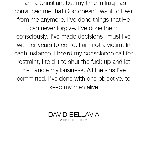 I am a Christian, but my time in Iraq has convinced me that God doesn't want to hear from me anymore. I've done things that He can never forgive. I've done them consciously. I've made decisions I must live with for years to come. I am not a victim. In each instance, I heard my conscience call for restraint, I told it to shut the fuck up and let me handle my business. All the sins I've committed, I've done with one objective: to keep my men alive