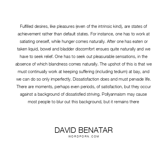 Fulfilled desires, like pleasures (even of the intrinsic kind), are states of achievement rather than default states. For instance, one has to work at satiating oneself, while hunger comes naturally. After one has eaten or taken liquid, bowel and bladder discomfort ensues quite naturally and we have to seek relief. One has to seek out pleasurable sensations, in the absence of which blandness comes naturally. The upshot of this is that we must continually work at keeping suffering (including tedium) at bay, and we can do so only imperfectly. Dissatisfaction does and must pervade life. There are moments, perhaps even periods, of satisfaction, but they occur against a background of dissatisfied striving. Pollyannaism may cause most people to blur out this background, but it remains there
