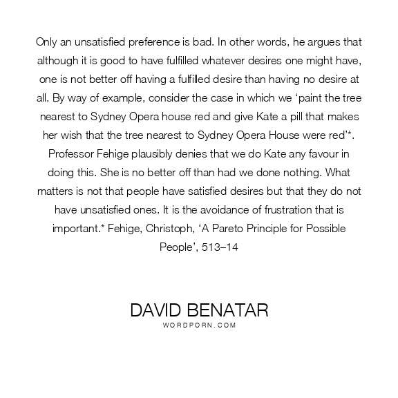Only an unsatisfied preference is bad. In other words, he argues that although it is good to have fulfilled whatever desires one might have, one is not better off having a fulfilled desire than having no desire at all. By way of example, consider the case in which we ‘paint the tree nearest to Sydney Opera house red and give Kate a pill that makes her wish that the tree nearest to Sydney Opera House were red’*. Professor Fehige plausibly denies that we do Kate any favour in doing this. She is no better off than had we done nothing. What matters is not that people have satisfied desires but that they do not have unsatisfied ones. It is the avoidance of frustration that is important.* Fehige, Christoph, ‘A Pareto Principle for Possible People’, 513–14