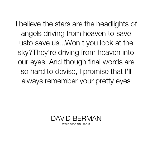 I believe the stars are the headlights of angels driving from heaven to save usto save us...Won't you look at the sky?They're driving from heaven into our eyes. And though final words are so hard to devise, I promise that I'll always remember your pretty eyes