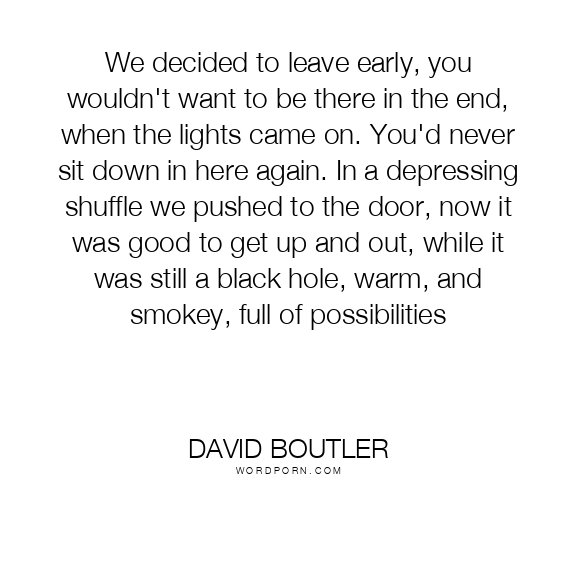 We decided to leave early, you wouldn't want to be there in the end, when the lights came on. You'd never sit down in here again. In a depressing shuffle we pushed to the door, now it was good to get up and out, while it was still a black hole, warm, and smokey, full of possibilities
