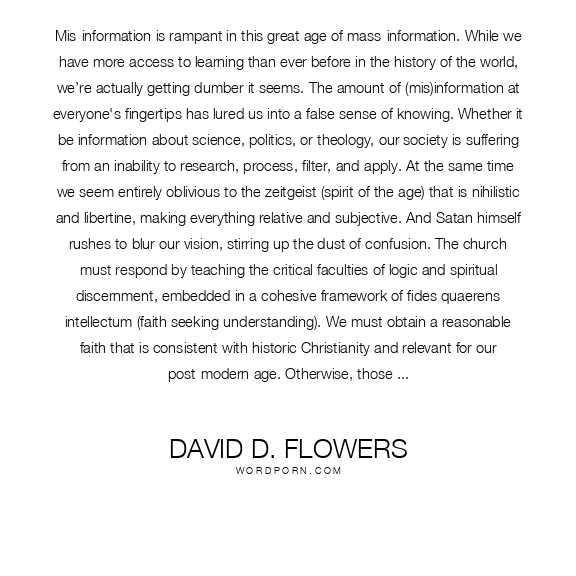 Mis-information is rampant in this great age of mass-information. While we have more access to learning than ever before in the history of the world, we’re actually getting dumber it seems. The amount of (mis)information at everyone's fingertips has lured us into a false sense of knowing. Whether it be information about science, politics, or theology, our society is suffering from an inability to research, process, filter, and apply. At the same time we seem entirely oblivious to the zeitgeist (spirit of the age) that is nihilistic and libertine, making everything relative and subjective. And Satan himself rushes to blur our vision, stirring up the dust of confusion. The church must respond by teaching the critical faculties of logic and spiritual discernment, embedded in a cohesive framework of fides quaerens intellectum (faith seeking understanding). We must obtain a reasonable faith that is consistent with historic Christianity and relevant for our post-modern age. Otherwise, those rejecting the blatant errors of religious fundamentalism will be susceptible to every wind of false doctrine and repackaged heresy imaginable. They will leave the orthodox faith and accept something that vaguely resembles Christianity, but in reality is a vile concoction of demonic lies