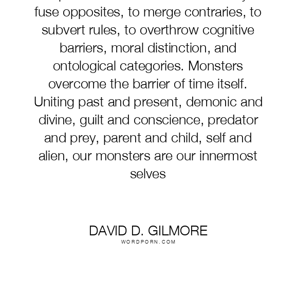 The power of monsters is their ability to fuse opposites, to merge contraries, to subvert rules, to overthrow cognitive barriers, moral distinction, and ontological categories. Monsters overcome the barrier of time itself. Uniting past and present, demonic and divine, guilt and conscience, predator and prey, parent and child, self and alien, our monsters are our innermost selves