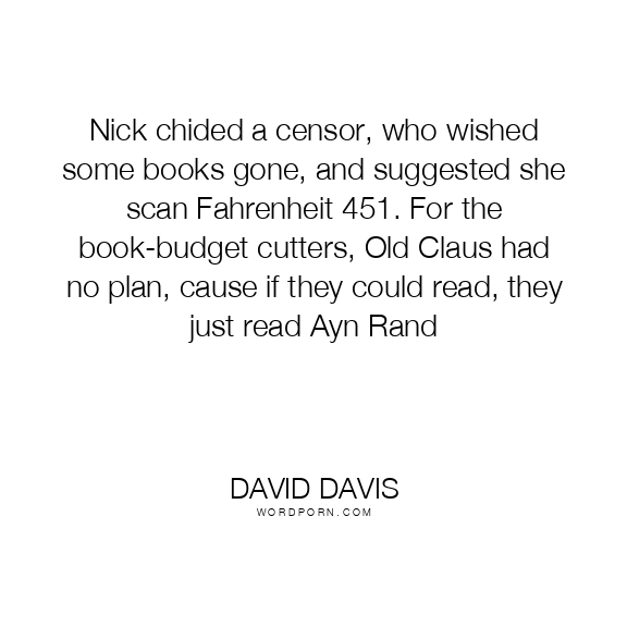 Nick chided a censor, who wished some books gone, and suggested she scan Fahrenheit 451. For the book-budget cutters, Old Claus had no plan, cause if they could read, they just read Ayn Rand
