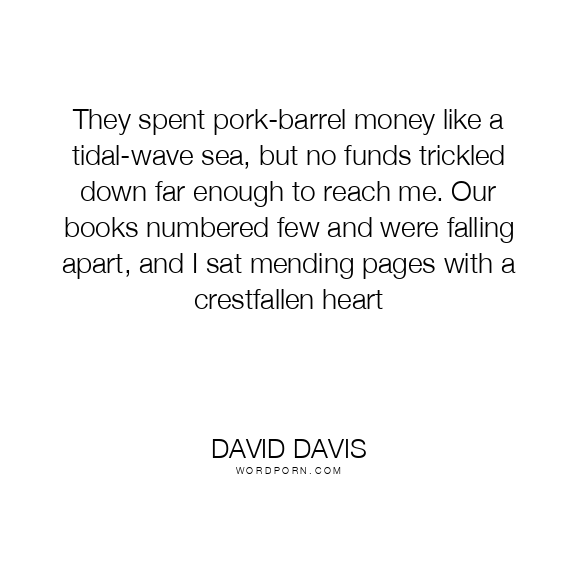 They spent pork-barrel money like a tidal-wave sea, but no funds trickled down far enough to reach me. Our books numbered few and were falling apart, and I sat mending pages with a crestfallen heart
