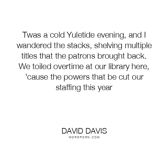 Twas a cold Yuletide evening, and I wandered the stacks, shelving multiple titles that the patrons brought back. We toiled overtime at our library here, 'cause the powers that be cut our staffing this year