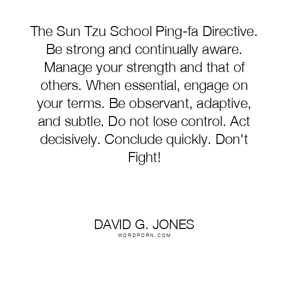 The Sun Tzu School Ping-fa Directive. Be strong and continually aware. Manage your strength and that of others. When essential, engage on your terms. Be observant, adaptive, and subtle. Do not lose control. Act decisively. Conclude quickly. Don't Fight!