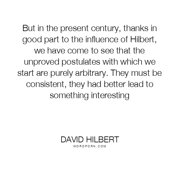 But in the present century, thanks in good part to the influence of Hilbert, we have come to see that the unproved postulates with which we start are purely arbitrary. They must be consistent, they had better lead to something interesting