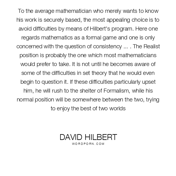 To the average mathematician who merely wants to know his work is securely based, the most appealing choice is to avoid difficulties by means of Hilbert's program. Here one regards mathematics as a formal game and one is only concerned with the question of consistency ... . The Realist position is probably the one which most mathematicians would prefer to take. It is not until he becomes aware of some of the difficulties in set theory that he would even begin to question it. If these difficulties particularly upset him, he will rush to the shelter of Formalism, while his normal position will be somewhere between the two, trying to enjoy the best of two worlds