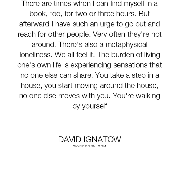 There are times when I can find myself in a book, too, for two or three hours. But afterward I have such an urge to go out and reach for other people. Very often they're not around. There's also a metaphysical loneliness. We all feel it. The burden of living one's own life is experiencing sensations that no one else can share. You take a step in a house, you start moving around the house, no one else moves with you. You're walking by yourself