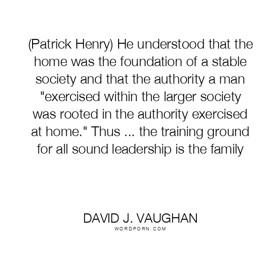 (Patrick Henry) He understood that the home was the foundation of a stable society and that the authority a man "exercised within the larger society was rooted in the authority exercised at home." Thus ... the training ground for all sound leadership is the family