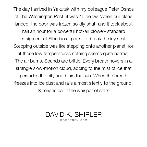 The day I arrived in Yakutsk with my colleague Peter Osnos of The Washington Post, it was 46 below. When our plane landed, the door was frozen solidly shut, and it took about half an hour for a powerful hot-air blower- standard equipment at Siberian airports- to break the icy seal. Stepping outside was like stepping onto another planet, for at those low temperatures nothing seems quite normal. The air burns. Sounds are brittle. Every breath hovers in a strangle slow-motion cloud, adding to the mist of ice that pervades the city and blurs the sun. When the breath freezes into ice dust and falls almost silently to the ground, Siberians call it the whisper of stars