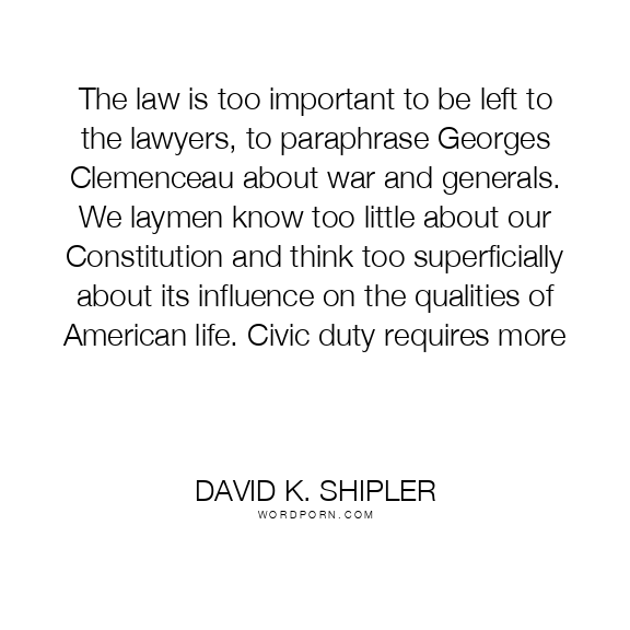 The law is too important to be left to the lawyers, to paraphrase Georges Clemenceau about war and generals. We laymen know too little about our Constitution and think too superficially about its influence on the qualities of American life. Civic duty requires more
