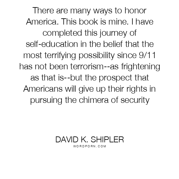 There are many ways to honor America. This book is mine. I have completed this journey of self-education in the belief that the most terrifying possibility since 9/11 has not been terrorism--as frightening as that is--but the prospect that Americans will give up their rights in pursuing the chimera of security
