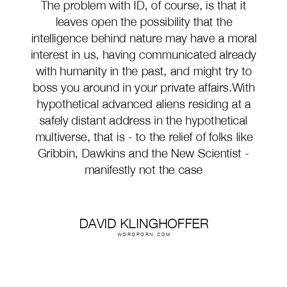 The problem with ID, of course, is that it leaves open the possibility that the intelligence behind nature may have a moral interest in us, having communicated already with humanity in the past, and might try to boss you around in your private affairs.With hypothetical advanced aliens residing at a safely distant address in the hypothetical multiverse, that is - to the relief of folks like Gribbin, Dawkins and the New Scientist - manifestly not the case