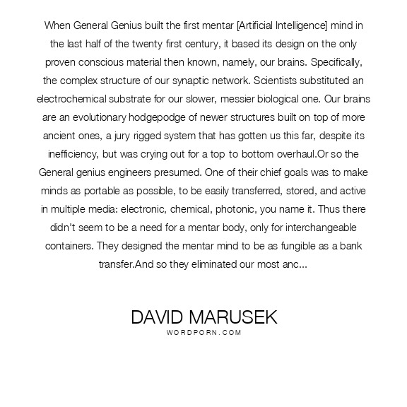 When General Genius built the first mentar [Artificial Intelligence] mind in the last half of the twenty-first century, it based its design on the only proven conscious material then known, namely, our brains. Specifically, the complex structure of our synaptic network. Scientists substituted an electrochemical substrate for our slower, messier biological one. Our brains are an evolutionary hodgepodge of newer structures built on top of more ancient ones, a jury-rigged system that has gotten us this far, despite its inefficiency, but was crying out for a top-to-bottom overhaul.Or so the General genius engineers presumed. One of their chief goals was to make minds as portable as possible, to be easily transferred, stored, and active in multiple media: electronic, chemical, photonic, you name it. Thus there didn't seem to be a need for a mentar body, only for interchangeable containers. They designed the mentar mind to be as fungible as a bank transfer.And so they eliminated our most ancient brain structures for regulating metabolic functions, and they adapted our sensory/motor networks to the control of peripherals.As it turns out, intelligence is not limited to neural networks, Merrill. Indeed, half of human intelligence resides in our bodies outside our skulls. This was intelligence the mentars never inherited from us....The genius of the irrational......We gave them only rational functions -- the ability to think and feel, but no irrational functions... Have you ever been in a tight situation where you relied on your 'gut instinct'? This is the body's intelligence, not the mind's. Every living cell possesses it. The mentar substrate has no indomitable will to survive, but ours does.Likewise, mentars have no 'fire in the belly,' but we do. They don't experience pure avarice or greed or pride. They're not very curious, or playful, or proud. They lack a sense of wonder and spirit of adventure. They have little initiative. Granted, their cognition is miraculous, but their personalities are rather pedantic.But probably their chief shortcoming is the lack of intuition. Of all the irrational faculties, intuition in the most powerful. Some say intuition transcends space-time. Have you ever heard of a mentar having a lucky hunch? They can bring incredible amounts of cognitive and computational power to bear on a seemingly intractable problem, only to see a dumb human with a lucky hunch walk away with the prize every time. Then there's luck itself. Some people have it, most don't, and no mentar does.So this makes them want our bodies...Our bodies, ape bodies, dog bodies, jellyfish bodies. They've tried them all. Every cell knows some neat tricks or survival, but the problem with cellular knowledge is that it's not at all fungible; nor are our memories. We're pretty much trapped in our containers