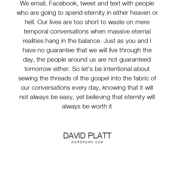 We email, Facebook, tweet and text with people who are going to spend eternity in either heaven or hell. Our lives are too short to waste on mere temporal conversations when massive eternal realities hang in the balance. Just as you and I have no guarantee that we will live through the day, the people around us are not guaranteed tomorrow either. So let's be intentional about sewing the threads of the gospel into the fabric of our conversations every day, knowing that it will not always be easy, yet believing that eternity will always be worth it