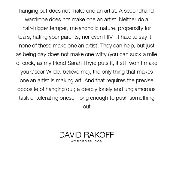 hanging out does not make one an artist. A secondhand wardrobe does not make one an artist. Neither do a hair-trigger temper, melancholic nature, propensity for tears, hating your parents, nor even HIV - I hate to say it - none of these make one an artist. They can help, but just as being gay does not make one witty (you can suck a mile of cock, as my friend Sarah Thyre puts it, it still won't make you Oscar Wilde, believe me), the only thing that makes one an artist is making art. And that requires the precise opposite of hanging out; a deeply lonely and unglamorous task of tolerating oneself long enough to push something out