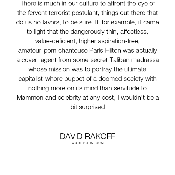 There is much in our culture to affront the eye of the fervent terrorist postulant, things out there that do us no favors, to be sure. If, for example, it came to light that the dangerously thin, affectless, value-deficient, higher aspiration-free, amateur-porn chanteuse Paris Hilton was actually a covert agent from some secret Taliban madrassa whose mission was to portray the ultimate capitalist-whore puppet of a doomed society with nothing more on its mind than servitude to Mammon and celebrity at any cost, I wouldn't be a bit surprised