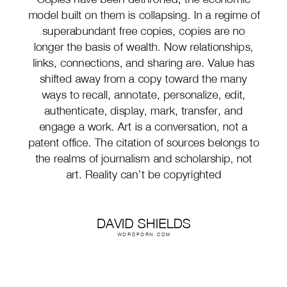 Copies have been dethroned; the economic model built on them is collapsing. In a regime of superabundant free copies, copies are no longer the basis of wealth. Now relationships, links, connections, and sharing are. Value has shifted away from a copy toward the many ways to recall, annotate, personalize, edit, authenticate, display, mark, transfer, and engage a work. Art is a conversation, not a patent office. The citation of sources belongs to the realms of journalism and scholarship, not art. Reality can’t be copyrighted