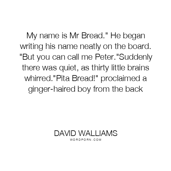 My name is Mr Bread." He began writing his name neatly on the board. "But you can call me Peter."Suddenly there was quiet, as thirty little brains whirred."Pita Bread!" proclaimed a ginger-haired boy from the back