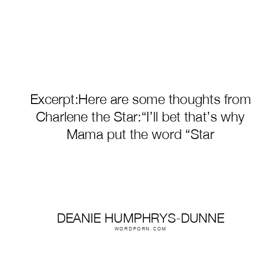Excerpt:Here are some thoughts from Charlene the Star:“I’ll bet that’s why Mama put the word “Star