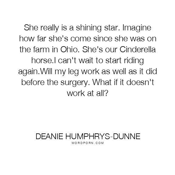 She really is a shining star. Imagine how far she's come since she was on the farm in Ohio. She's our Cinderella horse.I can't wait to start riding again.Will my leg work as well as it did before the surgery. What if it doesn't work at all?