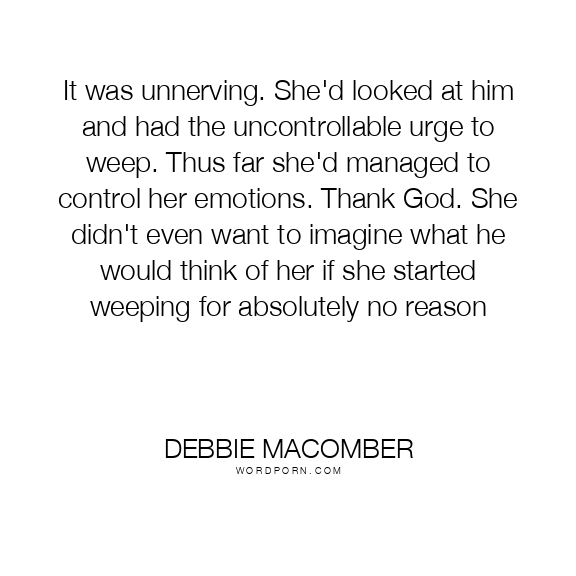 It was unnerving. She'd looked at him and had the uncontrollable urge to weep. Thus far she'd managed to control her emotions. Thank God. She didn't even want to imagine what he would think of her if she started weeping for absolutely no reason