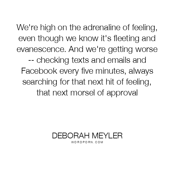 We're high on the adrenaline of feeling, even though we know it's fleeting and evanescence. And we're getting worse -- checking texts and emails and Facebook every five minutes, always searching for that next hit of feeling, that next morsel of approval
