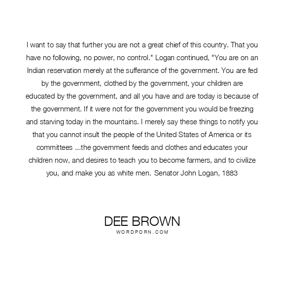 I want to say that further you are not a great chief of this country. That you have no following, no power, no control." Logan continued, "You are on an Indian reservation merely at the sufferance of the government. You are fed by the government, clothed by the government, your children are educated by the government, and all you have and are today is because of the government. If it were not for the government you would be freezing and starving today in the mountains. I merely say these things to notify you that you cannot insult the people of the United States of America or its committees ...the government feeds and clothes and educates your children now, and desires to teach you to become farmers, and to civilize you, and make you as white men.-Senator John Logan, 1883