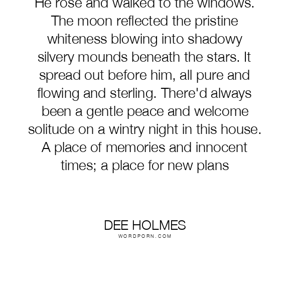 He rose and walked to the windows. The moon reflected the pristine whiteness blowing into shadowy silvery mounds beneath the stars. It spread out before him, all pure and flowing and sterling. There'd always been a gentle peace and welcome solitude on a wintry night in this house. A place of memories and innocent times; a place for new plans