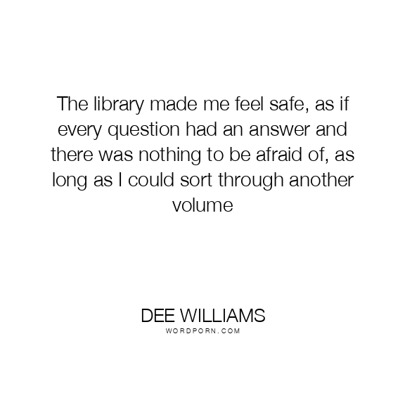 Dee Williams quote. The library made me feel safe, as if every question had an answer and there was nothing to be afraid of, as long as I could sort through another volume