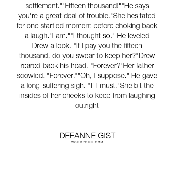 He wants a fifteen thousand pound settlement.""Fifteen thousand!""He says you're a great deal of trouble."She hesitated for one startled moment before choking back a laugh."I am.""I thought so." He leveled Drew a look. "If I pay you the fifteen thousand, do you swear to keep her?"Drew reared back his head. "Forever?"Her father scowled. "Forever.""Oh, I suppose." He gave a long-suffering sigh. "If I must."She bit the insides of her cheeks to keep from laughing outright