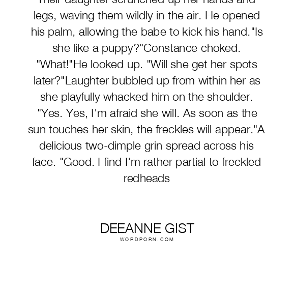 Their daughter scrunched up her hands and legs, waving them wildly in the air. He opened his palm, allowing the babe to kick his hand."Is she like a puppy?"Constance choked. "What!"He looked up. "Will she get her spots later?"Laughter bubbled up from within her as she playfully whacked him on the shoulder. "Yes. Yes, I'm afraid she will. As soon as the sun touches her skin, the freckles will appear."A delicious two-dimple grin spread across his face. "Good. I find I'm rather partial to freckled redheads