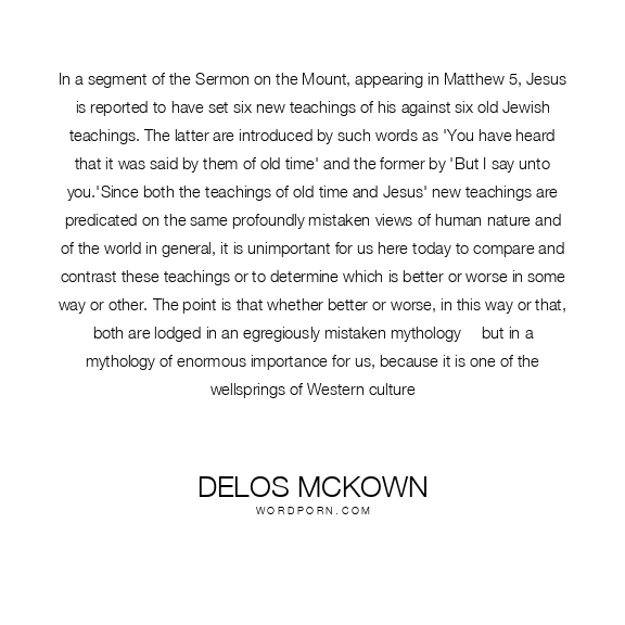 In a segment of the Sermon on the Mount, appearing in Matthew 5, Jesus is reported to have set six new teachings of his against six old Jewish teachings. The latter are introduced by such words as 'You have heard that it was said by them of old time' and the former by 'But I say unto you.'Since both the teachings of old time and Jesus' new teachings are predicated on the same profoundly mistaken views of human nature and of the world in general, it is unimportant for us here today to compare and contrast these teachings or to determine which is better or worse in some way or other. The point is that whether better or worse, in this way or that, both are lodged in an egregiously mistaken mythology -- but in a mythology of enormous importance for us, because it is one of the wellsprings of Western culture