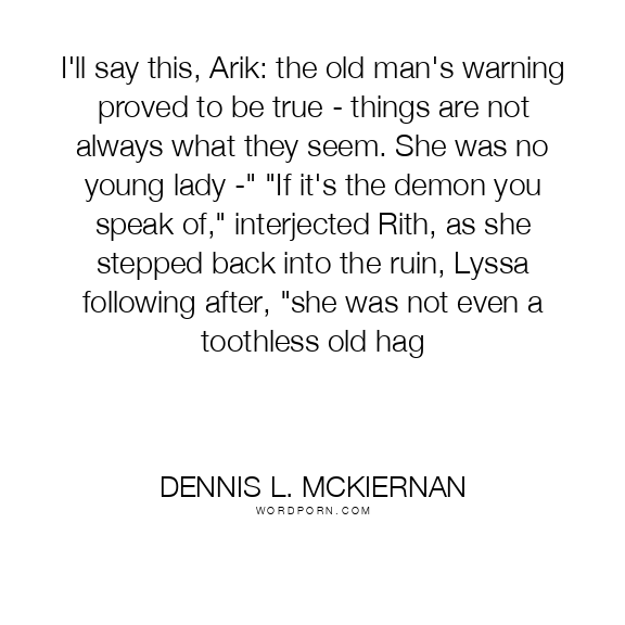 I'll say this, Arik: the old man's warning proved to be true - things are not always what they seem. She was no young lady -" "If it's the demon you speak of," interjected Rith, as she stepped back into the ruin, Lyssa following after, "she was not even a toothless old hag
