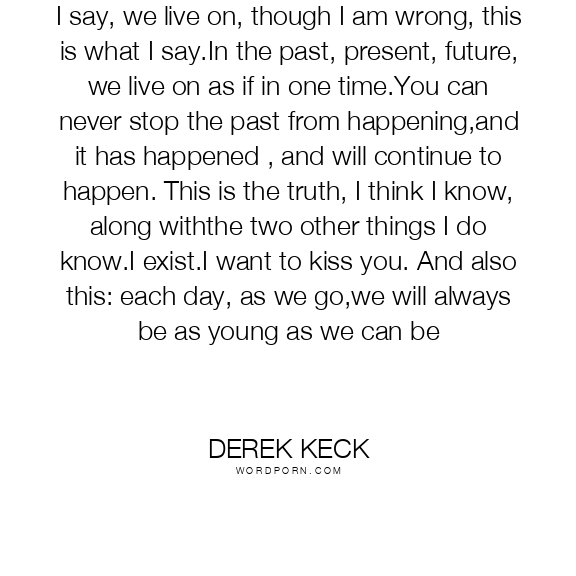 I say, we live on, though I am wrong, this is what I say.In the past, present, future, we live on as if in one time.You can never stop the past from happening,and it has happened , and will continue to happen. This is the truth, I think I know, along withthe two other things I do know.I exist.I want to kiss you. And also this: each day, as we go,we will always be as young as we can be