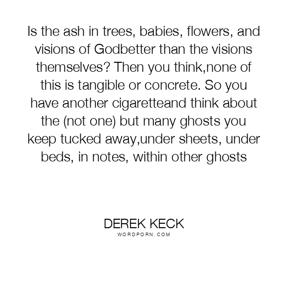Is the ash in trees, babies, flowers, and visions of Godbetter than the visions themselves? Then you think,none of this is tangible or concrete. So you have another cigaretteand think about the (not one) but many ghosts you keep tucked away,under sheets, under beds, in notes, within other ghosts