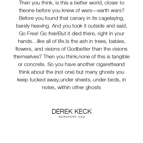 Then you think, is this a better world, closer to theone before you knew of wars—earth wars? Before you found that canary in its cagelaying, barely heaving. And you took it outside and said, Go Free! Go free!But it died there, right in your hands…like all of life.Is the ash in trees, babies, flowers, and visions of Godbetter than the visions themselves? Then you think,none of this is tangible or concrete. So you have another cigaretteand think about the (not one) but many ghosts you keep tucked away,under sheets, under beds, in notes, within other ghosts
