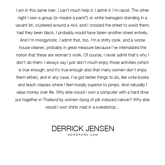 I am in this same river. I can't much help it. I admit it: I'm racist. The other night I saw a group (or maybe a pack?) or white teenagers standing in a vacant lot, clustered around a 4x4, and I crossed the street to avoid them; had they been black, I probably would have taken another street entirely. And I'm misogynistic. I admit that, too. I'm a shitty cook, and a worse house cleaner, probably in great measure because I've internalized the notion that these are woman's work. Of course, I never admit that's why I don't do them: I always say I just don't much enjoy those activities (which is true enough; and it's true enough also that many women don't enjoy them either), and in any case, I've got better things to do, like write books and teach classes where I feel morally superior to pimps. And naturally I value money over life. Why else would I own a computer with a hard drive put together in Thailand by women dying of job-induced cancer? Why else would I own shirts mad in a sweatshop in Bangladesh, and shoes put together in Mexico? The truth is that, although many of my best friends are people of color (as the cliche goes), and other of my best friends are women, I am part of this river: I benefit from the exploitation of others, and I do not much want to sacrifice this privilege. I am, after all, civilized, and have gained a taste for "comforts and elegancies" which can be gained only through the coercion of slavery. The truth is that like most others who benefit from this deep and broad river, I would probably rather die (and maybe even kill, or better, have someone kill for me) than trade places with the men, women, and children who made my computer, my shirt, my shoes